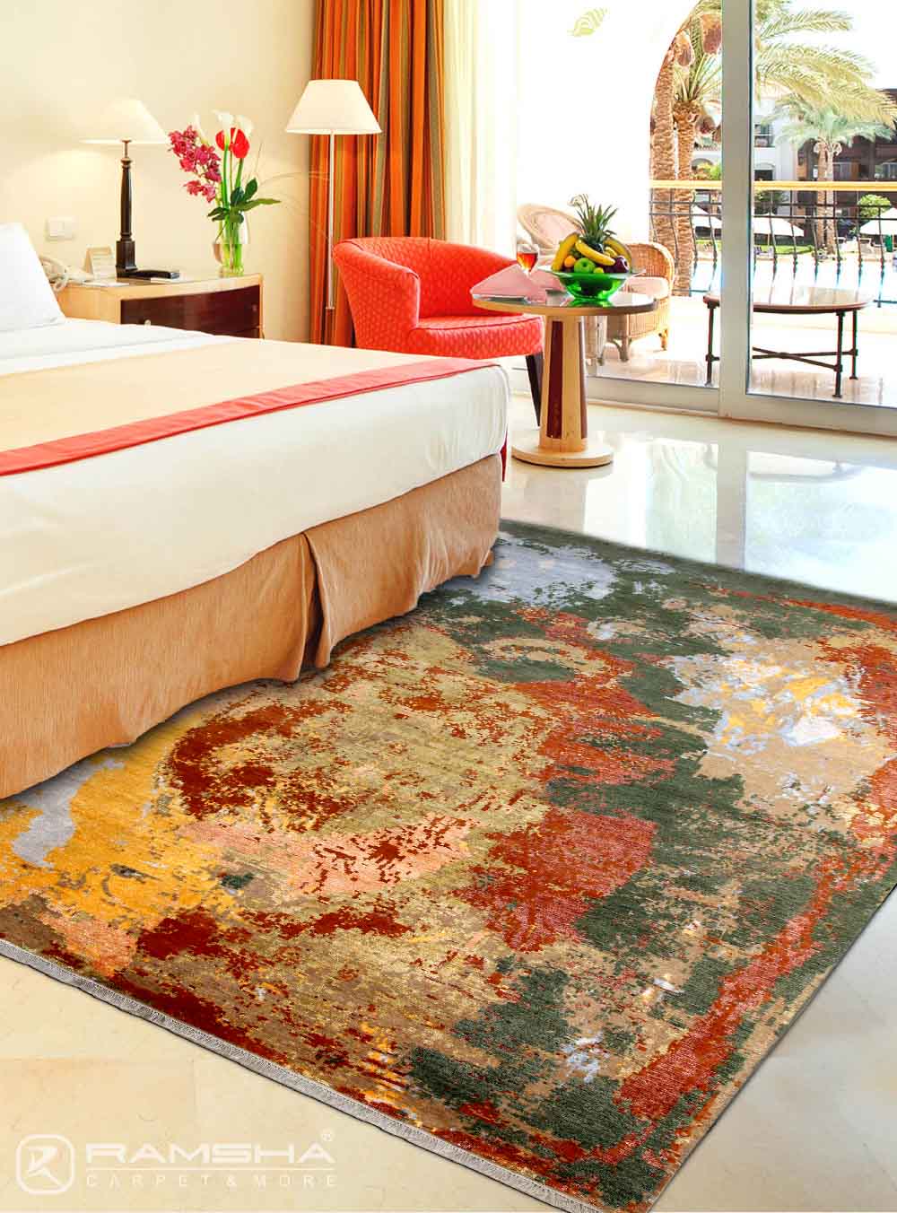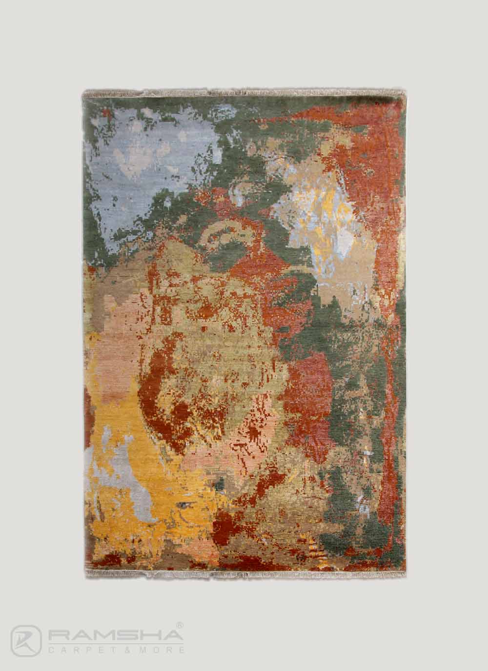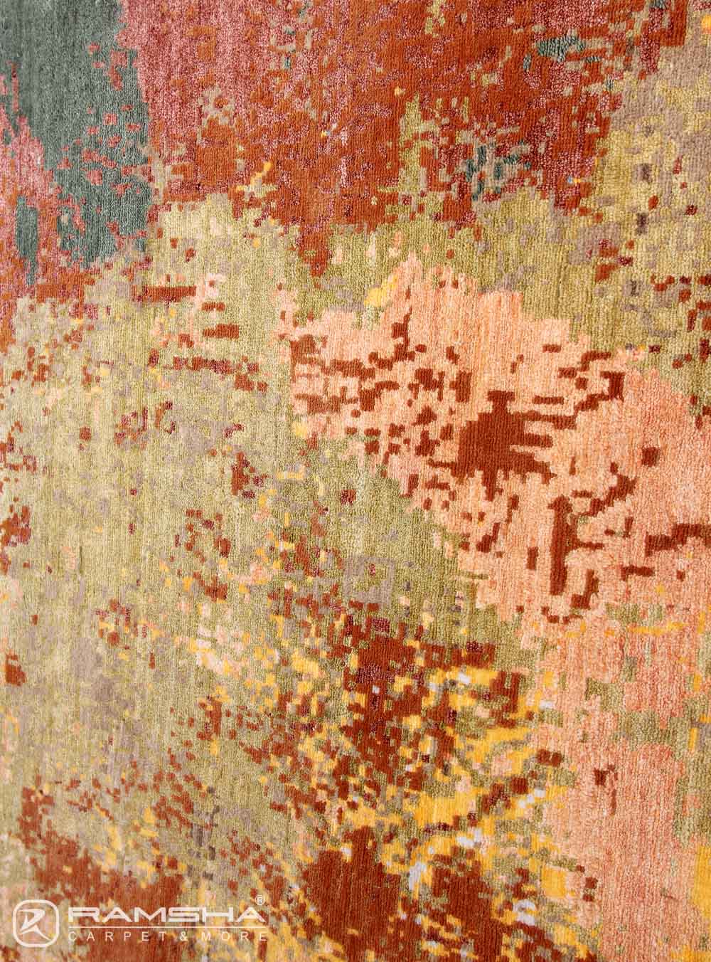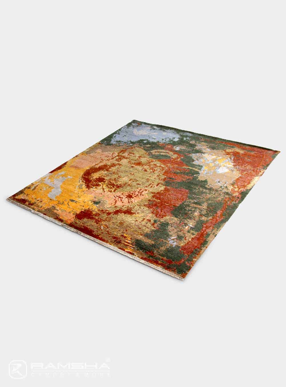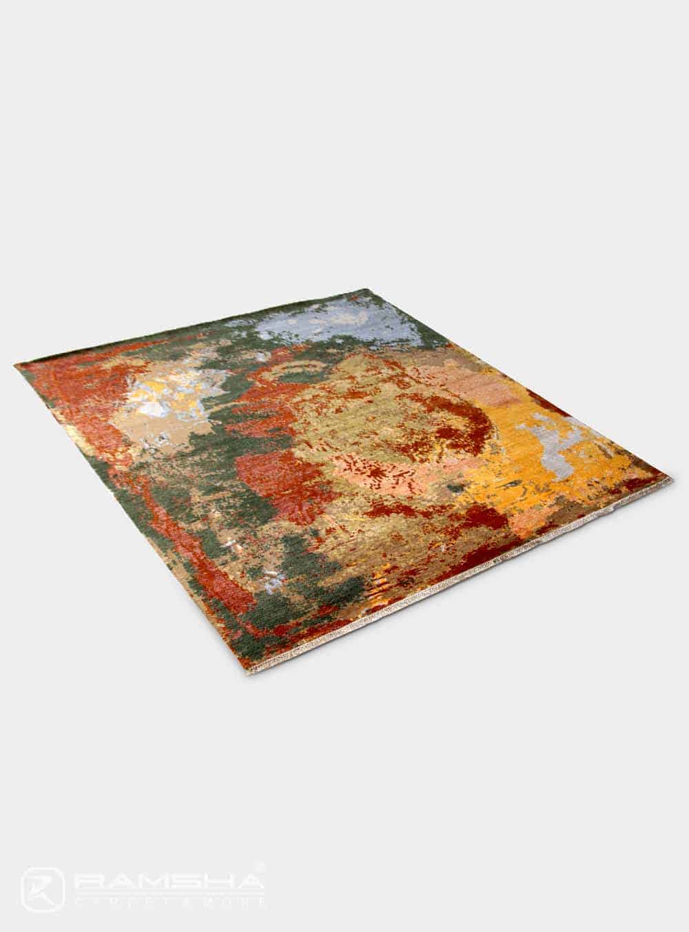 This striking hand-knotted carpet features a vivid abstract design, blending rich ochre yellows, deep rust oranges, and mossy greens into a painterly, multi-tonal composition. Hand-woven with premium natural fibers, its dense pile and artistic color-blocking provide a bold, contemporary focal point for sophisticated modern interiors.