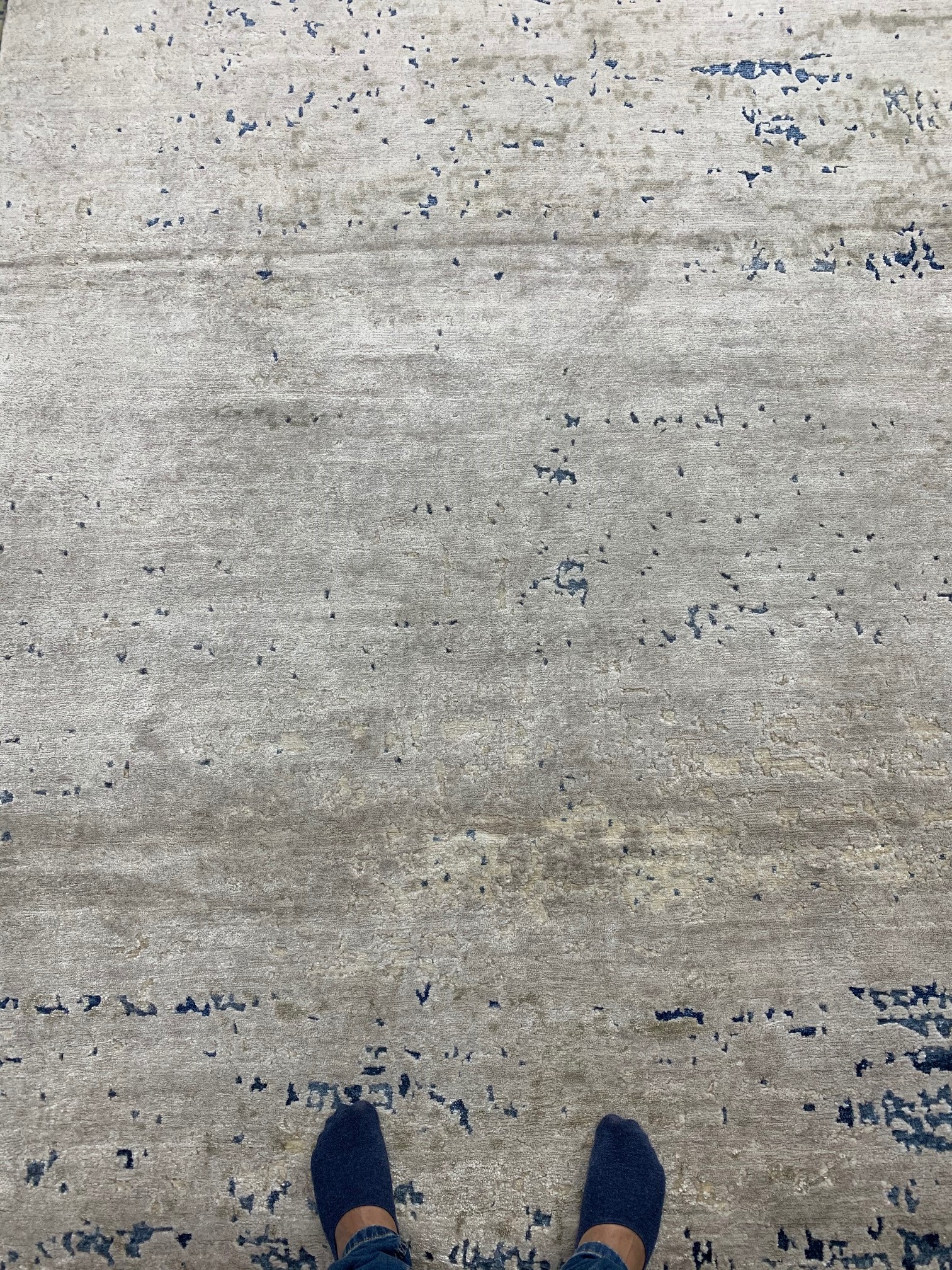 Bring a touch of modern luxury to your home with this hand-knotted carpet, featuring a shimmering silver-grey field punctuated by subtle pops of electric blue. Meticulously hand-woven with premium natural fibers, its low-profile pile and sophisticated horizontal abrash create a sleek, contemporary look that perfectly complements minimalist and transitional interiors.