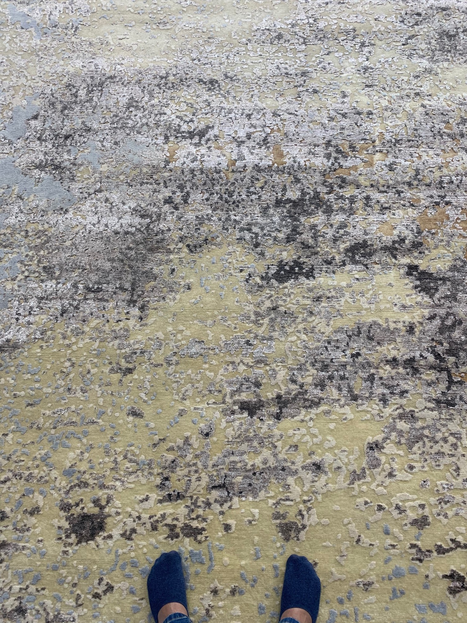 Infuse your space with vibrant energy using this hand-knotted abstract carpet, featuring a unique blend of citron yellow and mossy chartreuse set against deep charcoal shadows. Hand-woven with premium natural fibers, its complex eroded pattern and low-pile texture offer a high-end, contemporary aesthetic for modern living rooms and creative studio spaces.