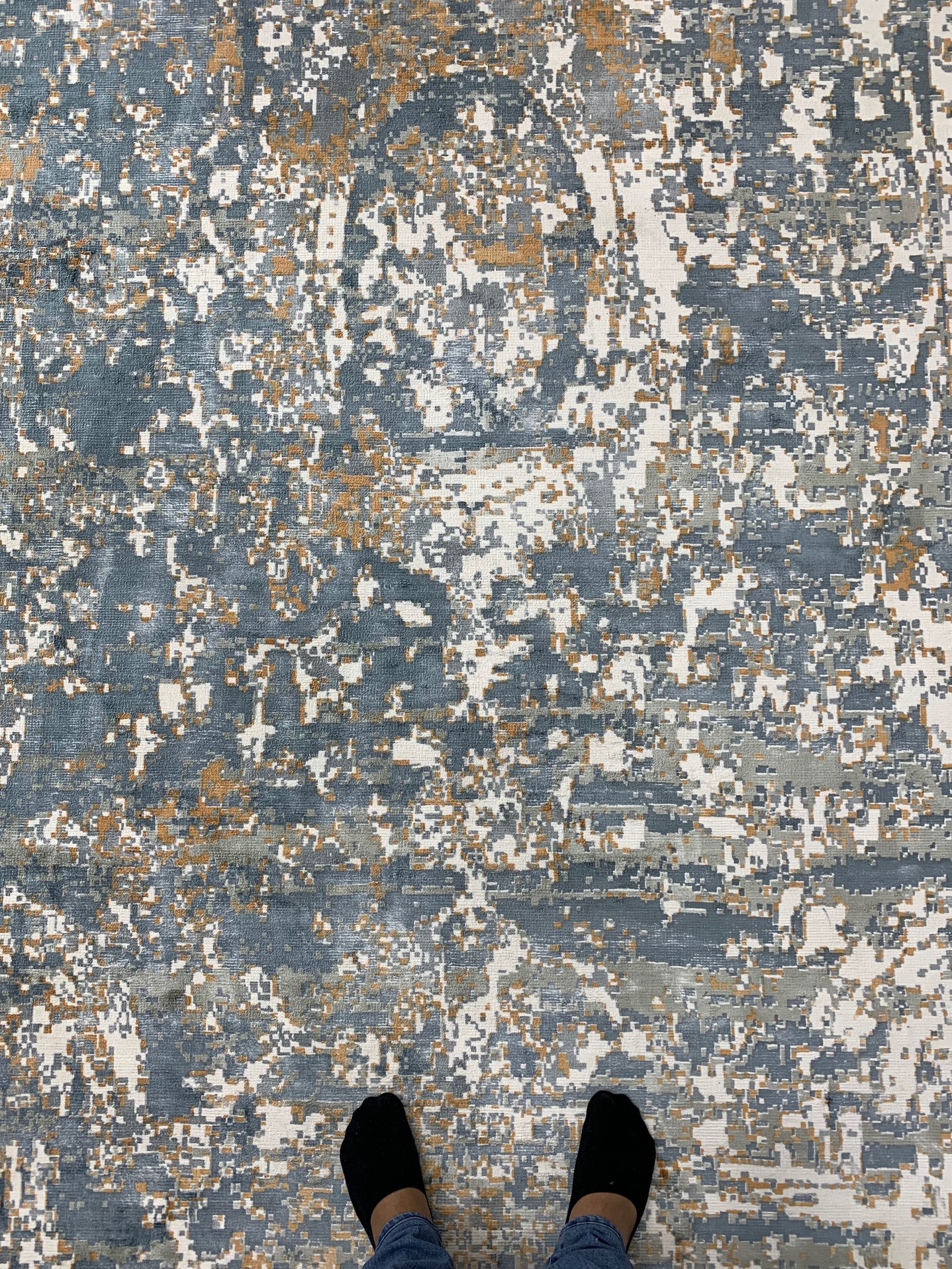 This exquisite hand-knotted rug features a beautifully distressed central medallion set against a soothing palette of denim, slate blue, and ivory. Meticulously hand-crafted with premium natural fibers, its weathered transitional pattern and subtle golden-ochre accents offer a refined, antique-inspired look that perfectly anchors both contemporary and traditional living spaces.