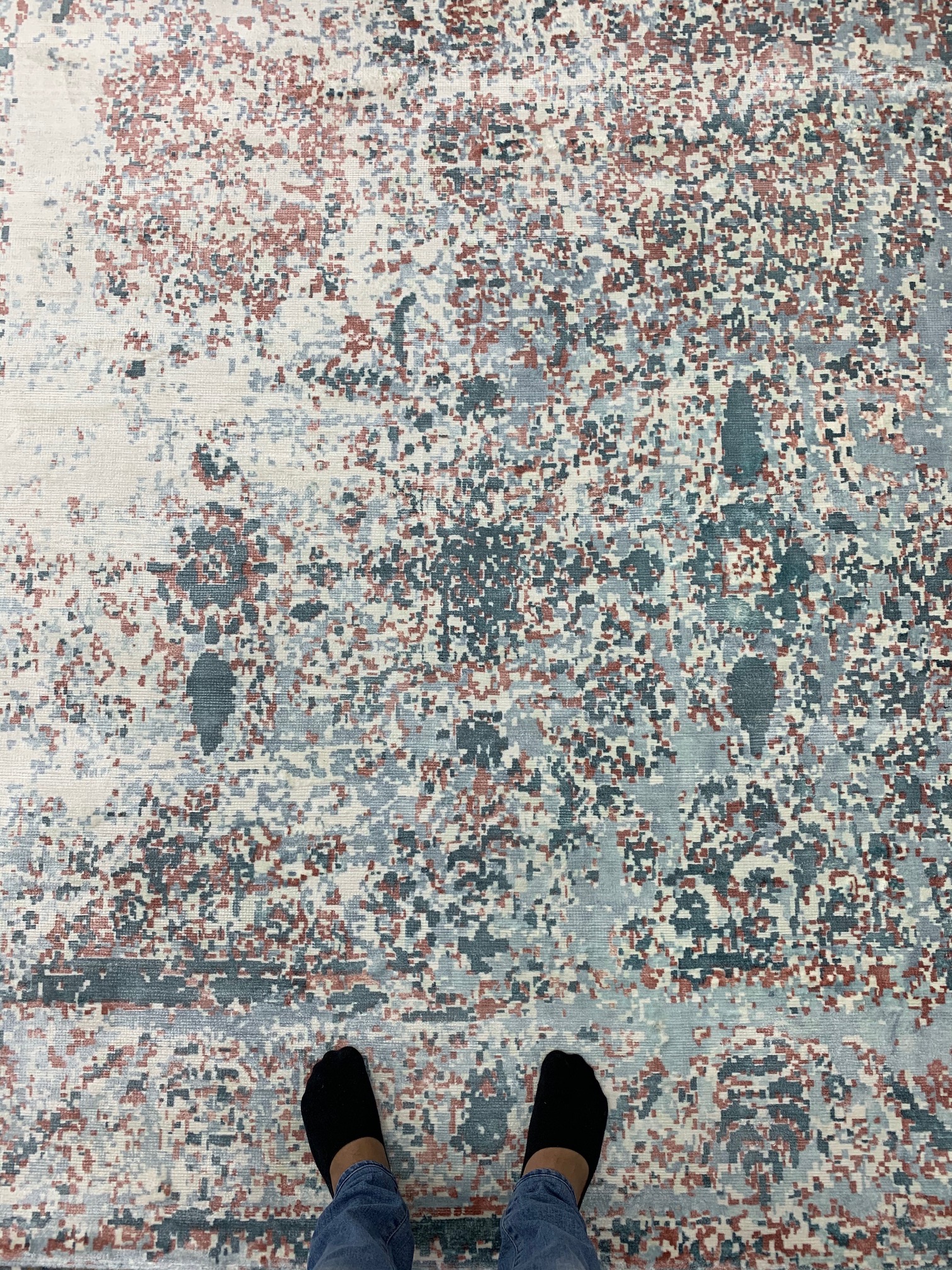 This magnificent hand-knotted carpet features an intricate, all-over floral trellis motif in a refined palette of slate blue, charcoal, and warm copper-rust highlights. Hand-woven with a high-density knot count and premium natural fibers, its faded, antique-inspired aesthetic and soft, low-pile texture provide a timeless elegance perfect for traditional dining rooms or high-end transitional interiors.